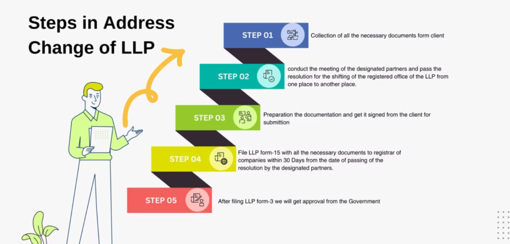 LLP can change place of its registered address to another place within the same State or between one States to another State through filling requisite LLP Form-15 and LLP Form-3 with the consent of Partners and creditors as may be required by law.